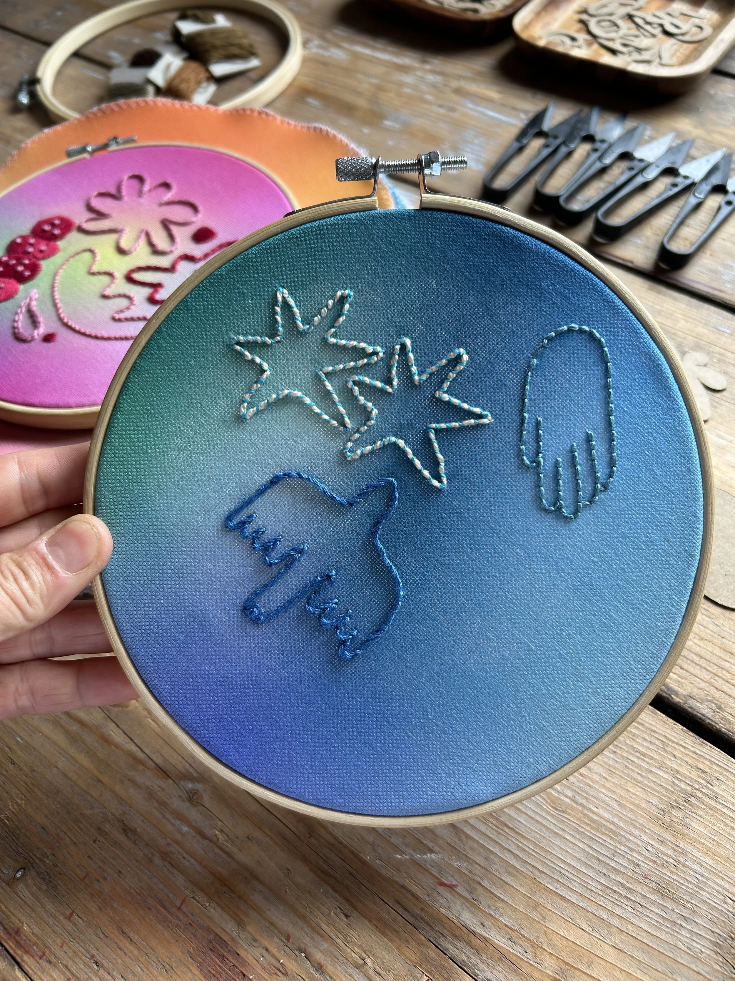 Discover the art of mindful embroidery through colorful shapes and the gentle practice of slow stitching. In this 6-hour workshop (split into two 3-hour sessions), you’ll explore basic stitches, experiment with vibrant designs, and create your own unique textile piece. Perfect for beginners and anyone seeking a relaxing, creative experience.